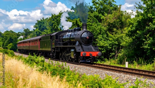 Obraz premium Vintage Steam Train Chugging Through Lush Green Landscape