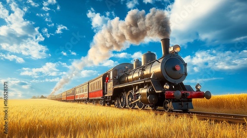Obraz premium Vintage steam train locomotive moving through golden wheat field on a sunny day.