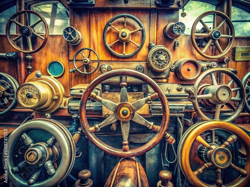 © Sandra, Obraz premium Vintage Steering Wheels: Automobiles, Ships, Bikes & Aircraft