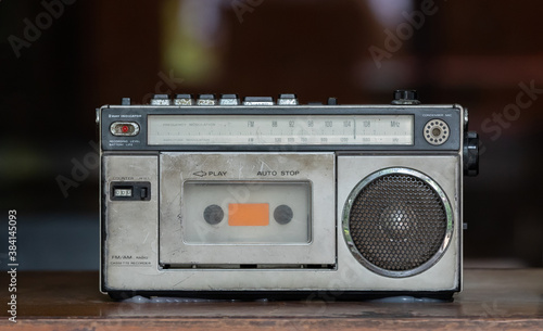 © Rattanachat, Fototapeta premium vintage stereo cassette recorder on wooden table. retro radio tuner.