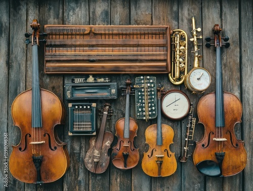 Naklejka premium Vintage string instruments on rustic wooden surface