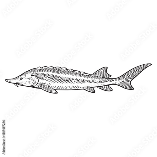 Fototapeta premium Vintage Sturgeon Fish Illustration - Black and White Hand-Drawn Aquatic Art...