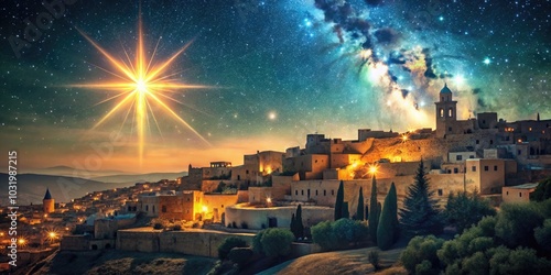 Fototapeta premium Vintage Style Photography of the Star of Bethlehem Illuminating the Birthplace of Jesus Near Jerusalem 2000 Years Ago, Capturing the Essence of Historical Spirituality and Cultural Heritage