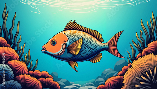 © Marousia, Naklejka premium Vintage-Style Snapper Swimming Amidst Vibrant Coral Reef Ecosystem