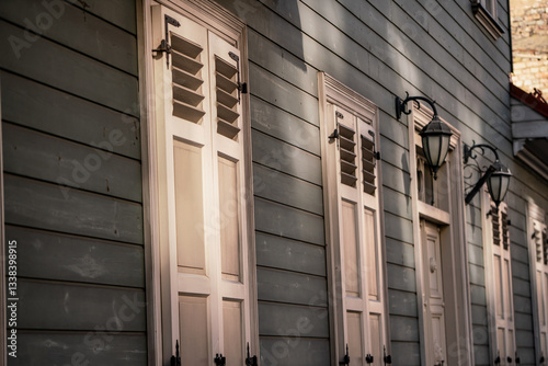 © K, Fototapeta premium Vintage style wooden window shutters in white color on green wooden building in Riga, Latvia. Retro style Riga building. Sun shining sun rays on old wooden building