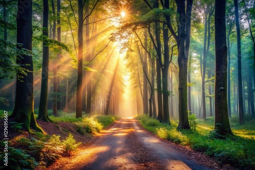 © Four888, Fototapeta premium Vintage Sunbeams: Misty Forest Path - Magical Woodland Scene