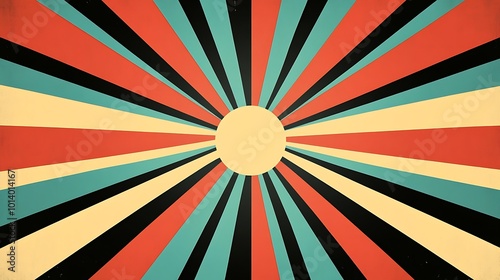 Fototapeta premium Vintage sunburst background with red, blue, yellow, and black stripes.