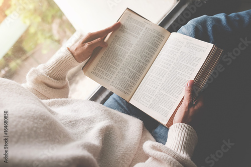 © MIND AND I, Obraz premium Vintage tone of Asia woman reading book in library