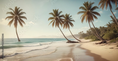 Obraz premium Vintage toned film photograph of a serene ocean landscape featuring swaying palm trees and a sunny beach , palm trees, beach