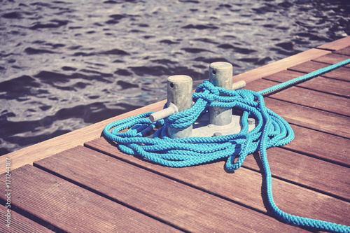 © MaciejBledowski, Obraz premium Vintage toned picture of a cleat with blue rope on a wooden pier, shallow depth of field.