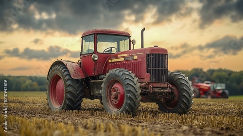 Fototapeta premium vintage tractor on a field, working alongside modern heavy machinery under a cloudy sky, contrast between old and new farming techniques