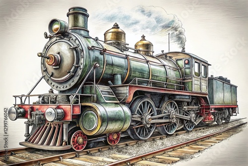 © Man888, Fototapeta premium Vintage Train Coloring Book Page: Detailed Steam Locomotive Illustration
