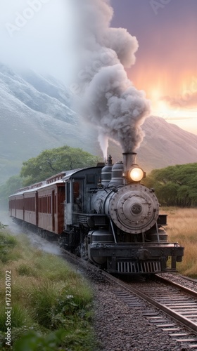 © tanawat, Obraz premium Vintage Train in the Mountains at Sunset