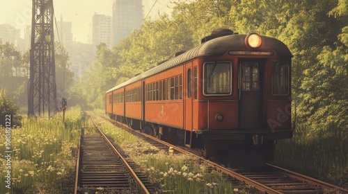 © Aekkachai, Fototapeta premium Vintage train on tracks with morning light.