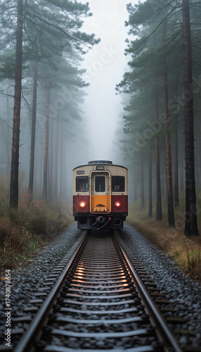 © Elmir, Naklejka premium Vintage train traveling on tracks through foggy pine forest