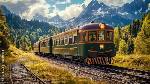 © Alice a., Naklejka premium vintage train travels through scenic mountain landscape, surrounded by lush greenery and towering peaks. picturesque view evokes sense of adventure and nostalgia