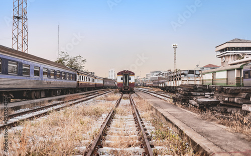 Fototapeta premium vintage train warehouse in sunset