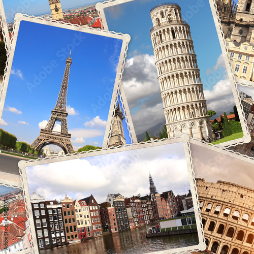 © frenta, Fototapeta premium Vintage travel background with retro photos of european landmarks
