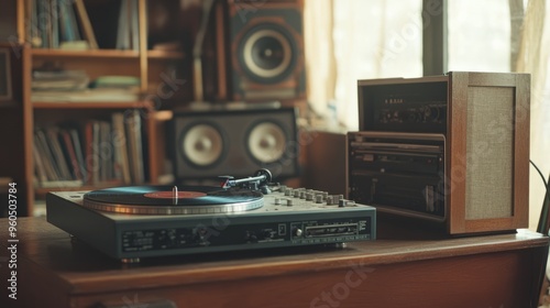 Fototapeta premium Vintage Turntable Revival: Classic Vinyl Sounds with Retro Amp & Speakers