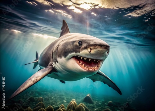 © Danicha, Fototapeta premium Vintage Underwater Great White Shark Close-Up: Jaws, Teeth, Ocean