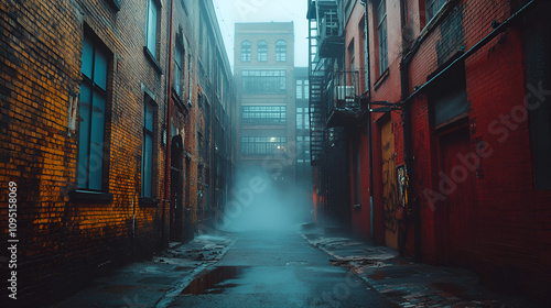 © Anna, Fototapeta premium Vintage Urban Street in Dense Fog with a Quiet but Ominous Mood. Ideal for Mysterious Story Settings