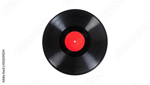 Obraz premium Vintage vinyl record with red label on black background, retro music nostalgia, classic analog audio disc isolated on dark backdrop