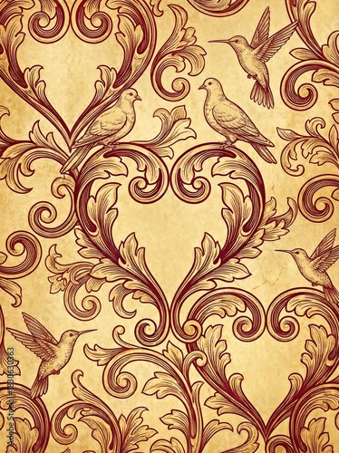 Fototapeta premium Vintage wallpaper with a botanical motif. An elegant repeating pattern of leaves, swirls, and birds on a distressed paper background