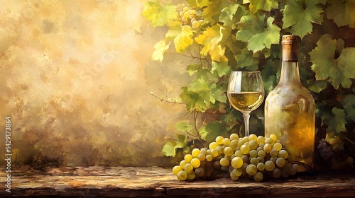 © Ounseng, Fototapeta premium Vintage wine bottle and glass on a rustic wooden table with grapes
