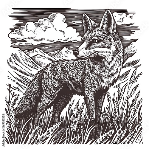 © Shelley, Fototapeta premium Vintage woodcut illustration of a detailed fox in the mountains, surrounded by clouds and grass, in black ink line art on a white background, resembling a linocut or engraving.