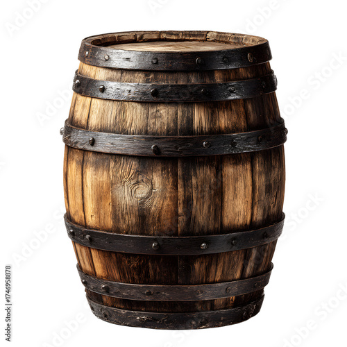 © khaas, Obraz premium Vintage Wooden Barrel with Iron Rings on Black Background for Design Projects