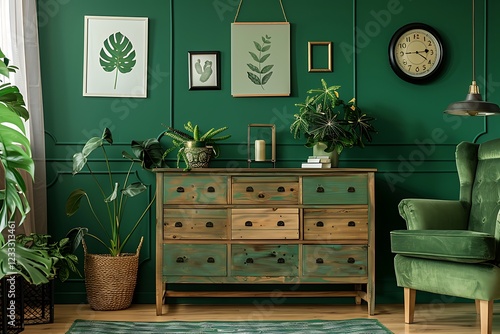 © MahmudulHassan, Obraz premium Vintage wooden chest of drawers in modern living room with tropical plants