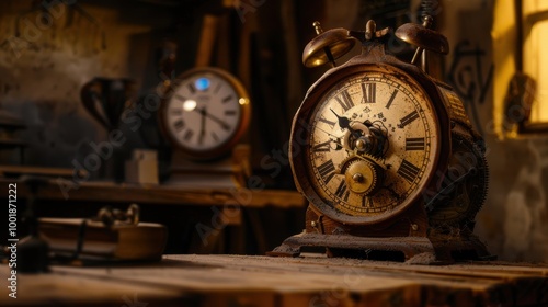 Fototapeta premium Vintage Wooden Clock with Brass Gears and Intricate Design