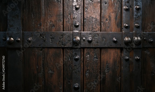 Fototapeta premium Vintage wooden door with aged metal rivets, its rustic texture telling a...