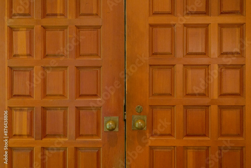 © Bryan, Fototapeta premium Vintage Wooden Double Front Doors With Intricate Square Panel Designs And Brass Knobs