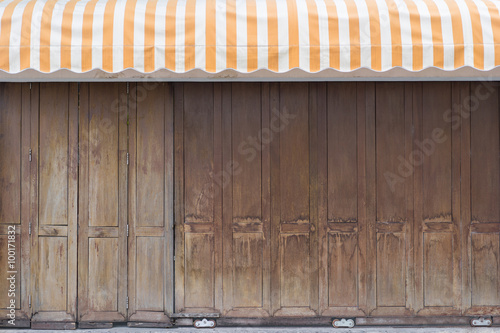 © Urbanscape, Fototapeta premium Vintage wooden gate with yellow stripe awning