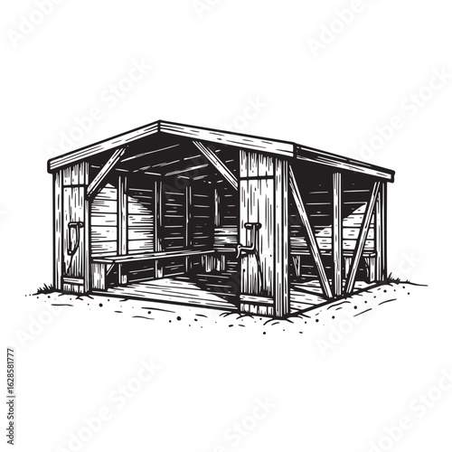 Obraz premium Vintage wooden shelter illustration in engraving style showcasing rustic architecture and design