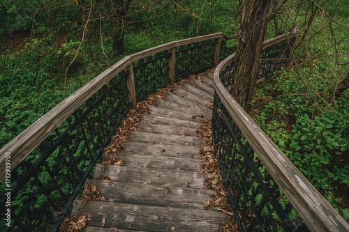 Obraz premium Vintage wooden steps featuring dark metal balusters in a garden setting