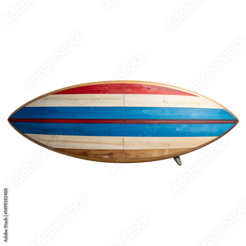 Fototapeta premium “Vintage Wooden Surfboard with Faded Stripes, isolated on white background”.PNG