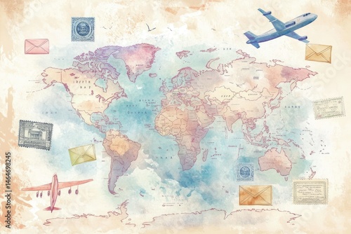 © Pixel Sculptor, Naklejka premium Vintage World Map with Envelopes and Airplanes