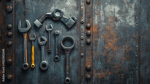 © Wish Craft Arts, Fototapeta premium Vintage wrenches with rusty metallic background.