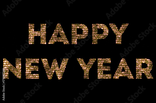 © donfiore, Fototapeta premium vintage yellow gold sparkly glitter lights and glowing effect simulating leds happy new year 2018, 2019, 2020, 2021, 2022 word text on black background with alpha channel, concept of golden