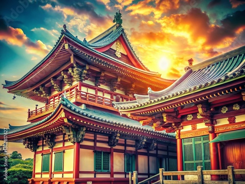 © Sirinporn, Fototapeta premium Vintage Yokohama Temple Architecture: Vibrant Colors & Intricate Details