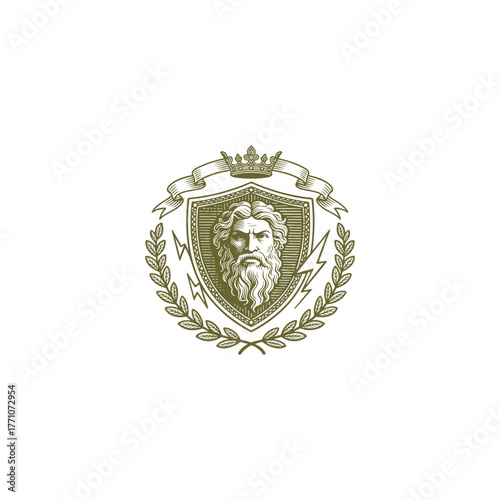 © synchronic, Fototapeta premium Vintage Zeus or Greek God crest logo vector illustration. Engraving style emblem featuring the King of Gods with a beard, surrounded by lightning bolts, a shield, crown, laurel wreath, and banner