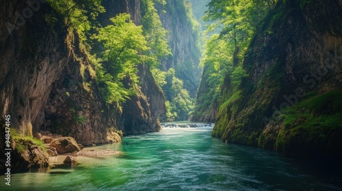 © Nuttaya Nampai, Fototapeta premium Vintgar Gorge's Beauty: Scenic shot of the Radovna River flowing through the lush Vintgar Gorge, surrounded by towering cliffs and vibrant vegetation.