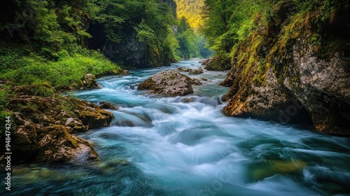 © Nuttaya Nampai, Fototapeta premium Vintgar Gorge's Charm: Captivating image of the Radovna River flowing through the enchanting Vintgar Gorge, surrounded by vibrant vegetation and rugged rocks.