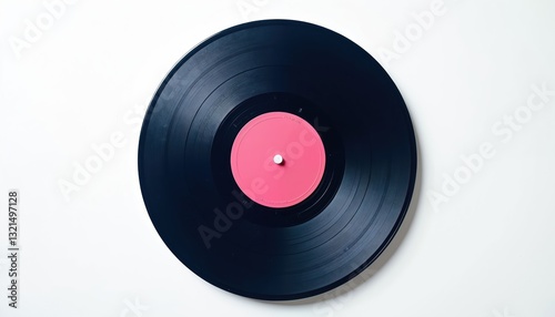 Fototapeta premium Vinyl gramophone record on white background. Dark music disc with pink label. Groove lines texture on dark plate. Retro analog sound carrier, vintage audio medium, stereo object. Perfect for cover