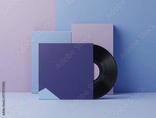Obraz premium Vinyl record leaning on its cover in a minimalist pastel setting