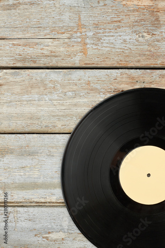 Obraz premium Vinyl record on old wooden background. Vinyl disc on rustic wooden planks and...