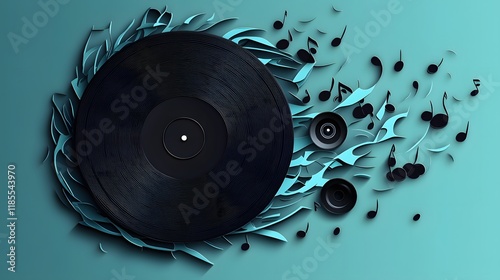 Obraz premium Vinyl Record Surrounded by Abstract Teal Music Notes