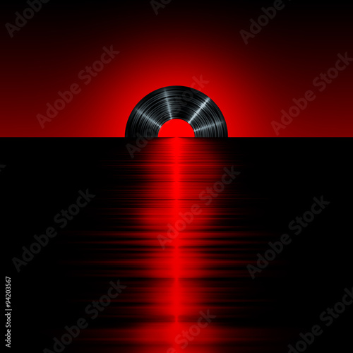 © grandeduc, Obraz premium Vinyl sunset red / 3D render of vinyl record as setting sun on horizon